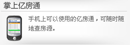 产品化的过程中,不断总结与提炼的呕心之作,是“亿房通”品牌的子产品。通过它,用户可以在手机上使用的精简版亿房通系统。掌上亿房通基于wap 2.0 技术构建,无需下载客户端,可直接在线使用。数据跟同店内亿房通系统保持同步。用户通过手机登录掌上亿房通系统,可及时查询并获取公司内部亿房通系统中的相关信息及业务动态。由于手机应用的便捷性,掌上亿房通成为经纪人随身携带的数据中心。有了掌上亿房通的支持,即使经纪人在户外带客户看房的过程中,也可以随时查询公司信息,及时地为客户推荐各种方案(或房源),大大提高经纪人的专业程度,从而提高成交率。